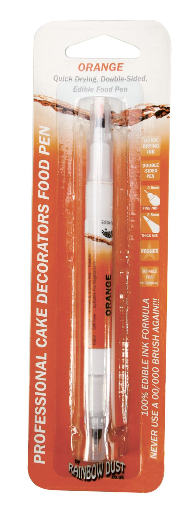 Rainbow Dust's food Pens are filled with edible ink. The Pens have a standard pen style 2.5mm nib which can be used for standard work and a fine 0.5mm nib for the fine detail such as adding facial features and intricate details. Orange color