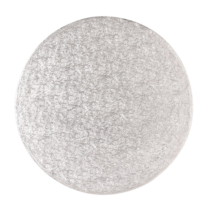 | Description | This is the strongest type of Cake Board. It has a bonded fibre board inner which is covered on the top and sides with a fern textured, silver coloured foil and with white paper on the base. The finished Cake Board is 0.5'' (13mm) thick, with a 8'' (200mm) round top. The Cake Boards are not individually wrapped. |