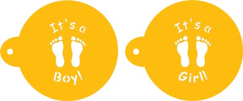 | Description | Two baby footprint It's A Boy and It's A Girl stencils which are perfect for creating cookies or candies for baby showers. Each stencil measures fits within a 1.5" or 3.75 cm circle. The stencils are made of durable 10 mil food grade plastic for high-quality, professional, repeat use. These stencils are also available in a larger size (#C064) which fit within a 3.5" or 8.75 cm circle.