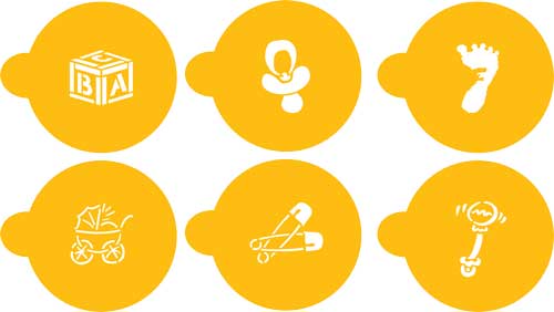 | Description | Perfect for creating cookies or candies for baby showers, this is a set of six baby designs. Each stencil fits within a 1.5" or 3.75 cm circle. These designs are made of durable 10 mil food grade plastic for high-quality, professional, repeat use. This set is also available in a larger size to fit a 3" or 7.5 cm circle (#C197).