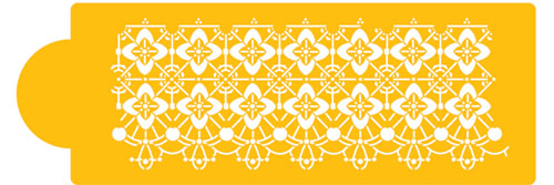 | Description | This stencil is the second tier pattern shown on the Victorian Crochet tiered cake set shown in the Martha Stewart Weddings - Fall 2009 issue. The stencil measures 3.6"H x 9"W or 9 cm H x 22.5 cm W and is cut out of 10 mil, durable food-grade plastic. |