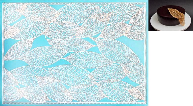 | Description | Smooth Tricot Mix over the incised designs. When set, peel beautiful lace lengths to wrap around cakes, and cupcakes, or cut sections from the lace to place on cookies, chocolate, and other desserts. Use as a full sheet to cascade from cake layer to cake layer, or cut one leaf separately from this mat for an exquisitely elegant presentation. Gather the center stem onto a rice noodle for a realistic skeletonized leaf. |