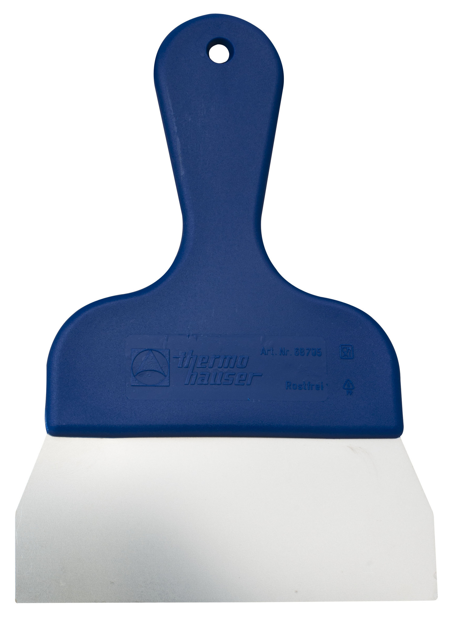 Use as spatula or scrapper with stainless steel blade with blue handle made of plastic.