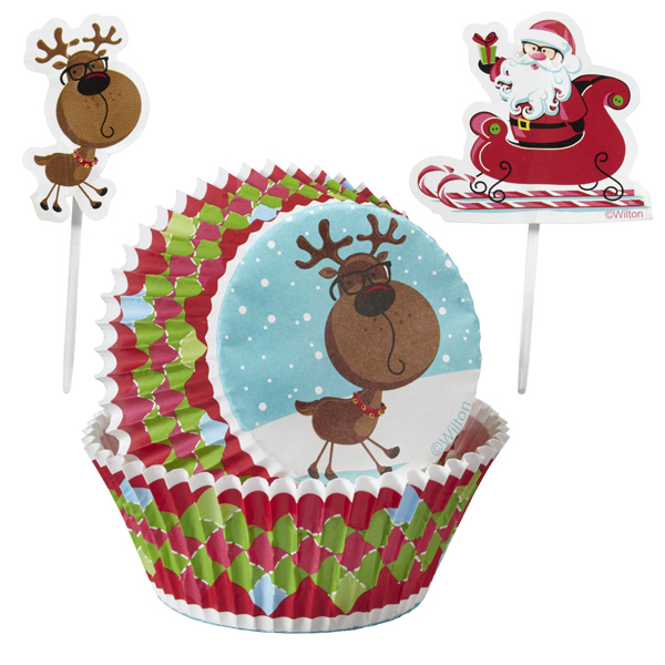 Bake cupcakes in the red, green and snowy blue argyle-patterned baking cups. Ice your cupcakes, and insert the pick, featuring a modern glasses-wearing reindeer. Decorate sweet treats for a holiday party, or share them with friends and family. Combo pack includes 24 baking cups and 24 picks. |