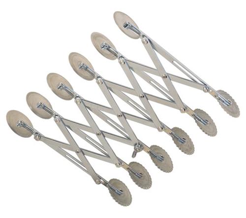 | Description | 12 wheel pastry cutter is constructed of stainless steel, making it extremely durable and ensuring that it will last you through repeated usage. Its 12 wheels, each measuring 2 1/8" in or 5.3 cm diameter, are riveted on an expandable arm. When fully extended, there is approximately 5" or 12.5 cm of space between each wheel. For safety and precision, the cutting wheels can be locked into place by tightening the wingnut located in the center of the adjustable arm. This 12 wheel cutter is great for cutting pastry dough, or even pizza dough, and is sure to make precise, measured cuts every time. |