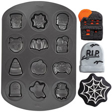Includes 12 classic shapes for your Halloween cookies and single-serving molded desserts. Shapes include ghost, spider, boiling pot, tombstone, cat, bat, monster, haunted house, candy corn and pumpkin.