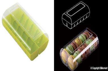 Description Macaroons Box is a practical, resistant and functional plastic box for macaroons. Available in for 12 macaroons. It is composed by a transparent cover, and a tray available in 4 design colors. The cover can be closed hermetically with a stable joint. In this way macaroons are protected from humidity. Furthermore, thanks to its transparency, the products inside are clearly visible. The bottom of box is endowed with a structure that separate every single macaroon so that they do not get damaged when displayed or carried.