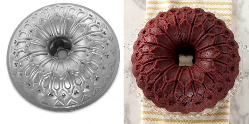 An intricate stained glass window inspired the design of this handsome pan. This Bunt pan produces cakes that are equally artful!