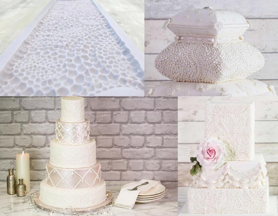 | Description | Create perfect pearl designs in seconds! This mould allows you to cover entire tiers in a beautiful pearl pattern quickly and easily! No need to spend hours moulding individual strands of pearls! Why not get creative and try using the mould as a gravel effect as seen in the plant pot cake example! Perfect for wedding cakes, anniversary cakes, birthday cakes and much more! Our moulds can be used for Sugarpaste, Flower paste, Marzipan, Modelling paste, Chocolate, Candy, Boiled Sugar, Saltdough, Air Drying Clays, Cold Porcelain and Embossing Powder. |