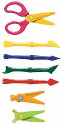 Kid-safe scissors have 3 snap-on blades that fit the same handle. Four sculpting tools help carve fun shapes.