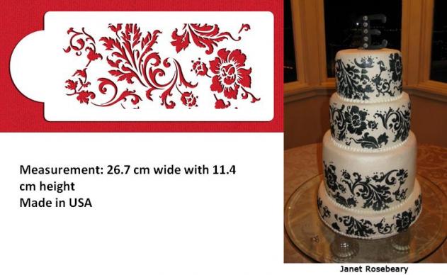 This chic rose cake stencil pattern measures 4.5"H x 10.5"W and is cut from a durable, 10 mil food-grade plastic