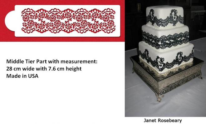 This Alencon lace middle tier cake stencil pattern measures 3"H x 11"W. Made from durable 10 mil food-grade plastic for repeated use.