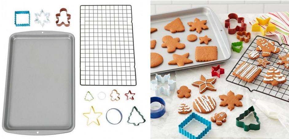 | Description | Baking lots of holiday cookies is more fun when you've got all the right tools. This set has just what you need to get started, including a large non-stick cookie sheet, cooling grid and 10 metal cookie cutters in jolly holiday shapes. This cookie baking set is a must-have for your cookie exchange baking this season! Shapes include: Large and small circles, large and small Christmas trees, large and small stars, large and small gingerbread men, snowflake, and square with scalloped edges. |