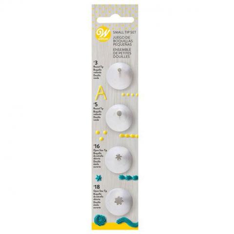 | Description | Set of four Wilton tips for making lines, dots, pearls, dropflowers, star techniques and more. This set contains the following tips: 3, 5, 16, 18. Packed per set of four in blister pack (carded) Suitable for the dishwasher. These tips work with standard bags and couplers. |