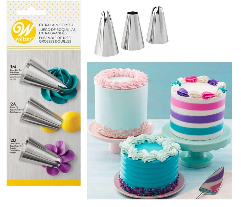 | Description | Do you love making big and bold cake decorations? This 3-piece decorating tip set is for you! It includes extra-large piping tips that are great for making the famous 1M swirl, plus drop flowers, dots, stars and more. Each tip is top-rack dishwasher safe for easy cleanup. Specifications: