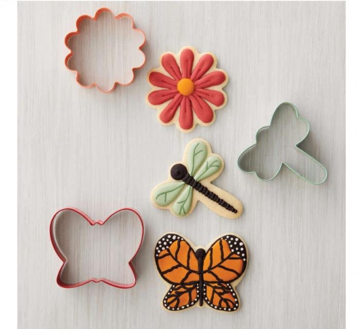 • Includes three designs: a daisy cookie cutter, a butterfly cookie cutter, and a dragonfly cookie cutter