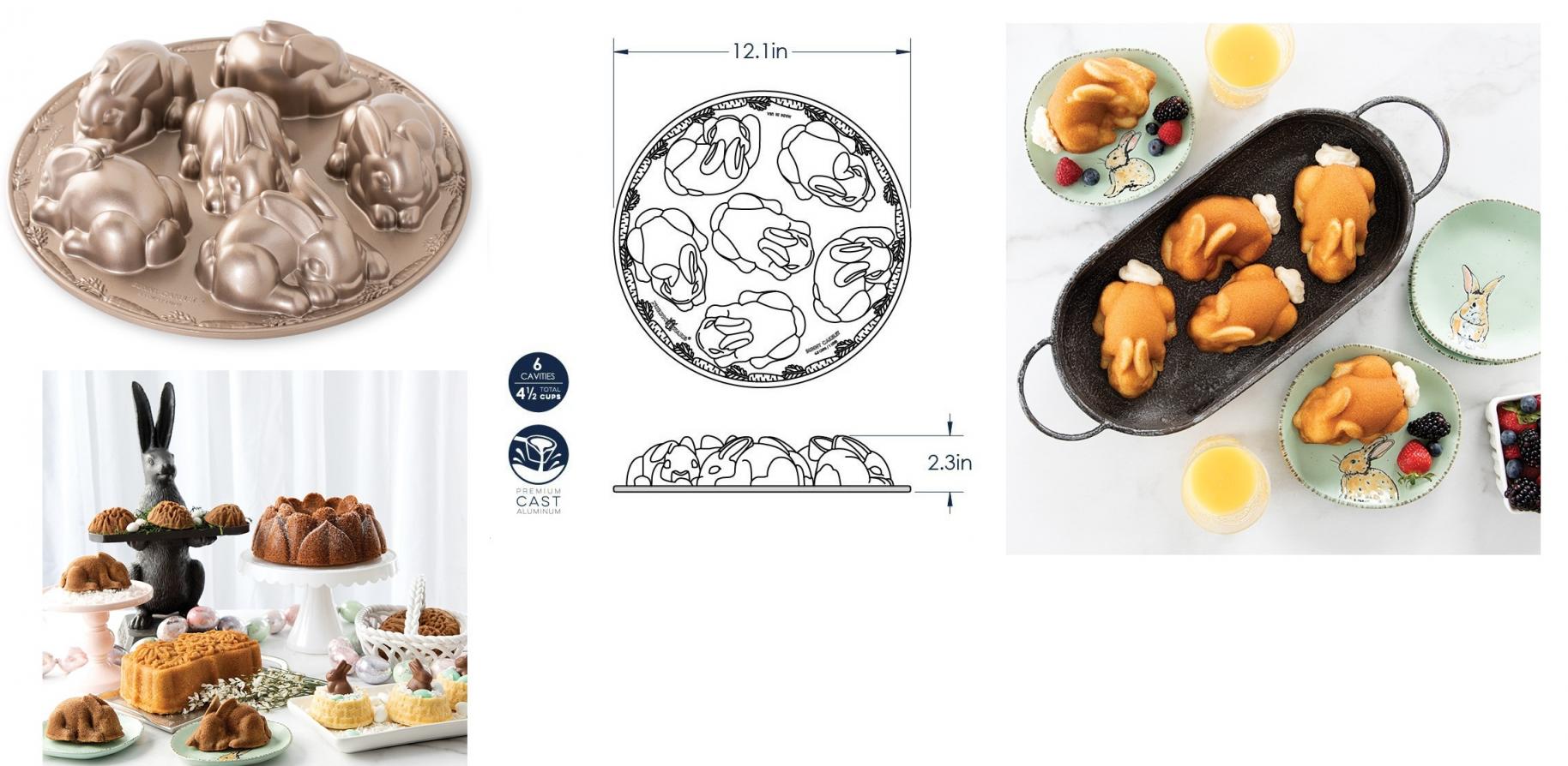 | Description | Bake a bunch of baby bunnies! Honestly, what could be cuter than this? Four and a half cup capacity. Use & Care: 1. Before initial use and after subsequent uses, hand wash with warm, soapy water. Extended soaking is not recommended. 2. Before each use, brush with butter or shortening and dust with flour or cocoa to coat. Baking spray containing flour may also be used. Do not use regular cooking spray. 3. Mixes and recipes may vary. Fill the pan no more than 3/4 full to avoid overflow. 4. Metal utensils, scouring pads and abrasive cleaners should not be used on nonstick surfaces. |
